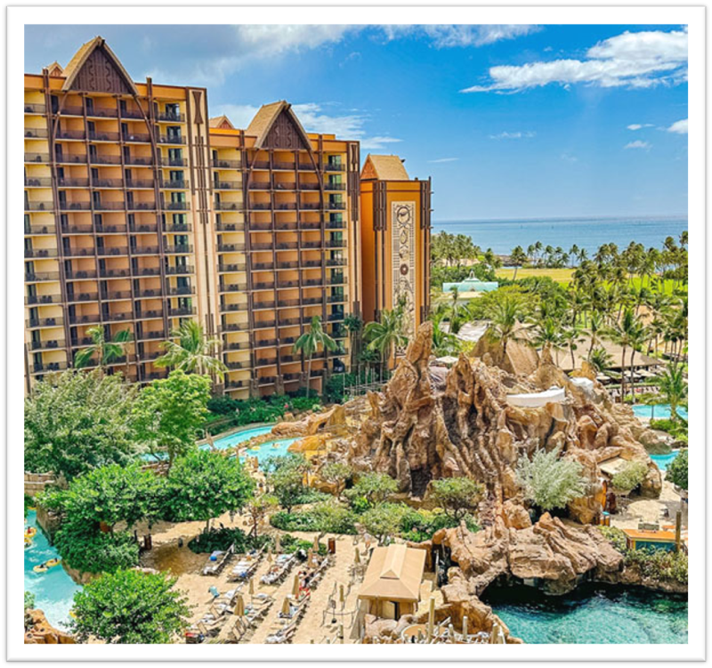 Designed in collaboration with Hawaiian cultural experts, the resort beautifully blends Disney magic with the rich history and natural beauty of the islands. Guests can enjoy a sprawling water play area, Waikolohe Valley, featuring a lazy river, thrilling waterslides, and dedicated splash zones for kids. Character greetings with Mickey, Minnie, and even Moana, offer delightful photo opportunities.